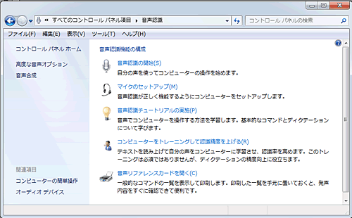 利用するには先にマイクの調整などを行う必要がある。「コントロールパネル」から「音声認識」をクリックすると、次の画面が表示される。コントロールパネルの画面表示としては、右上の「表示方法」から「大きい(小さい)アイコン」を選択すると分かりやすい。