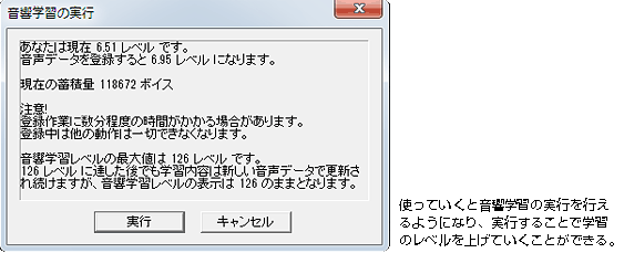 上に挙げた「音響学習の実行」で現在の自分のレベルを確認できるが、まずは最大目標レベルといえるだろう126まで育てれば、また違う感想になるのだろうと思う。こういうところは、RPGのようなレベル上げの楽しみも味わいながら育てていけるという感覚も、(私は)なきにしもあらず。「AmiVoice SP2」は、まさに育てていくソフトだろう。