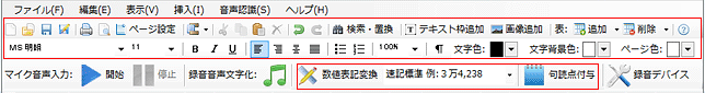 エディタには多彩な機能が用意されており、音声認識後もそのまま作業が可能。ツールバーの上側にはテキストの編集・整形等ができるワープロ機能、下側の真ん中の領域には独自機能として「数値表記変換」と「句読点付与」が備えられている。