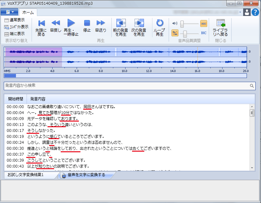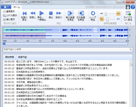 音声や文字変換結果を確認したい場合、「音声を確認」あるいは「編集を開始/再開」(図1参照)からホーム画面(編集プレーヤー)に移動でき、そこで音声の波形情報や発言箇所検出結果、文字変換結果を確認できる。