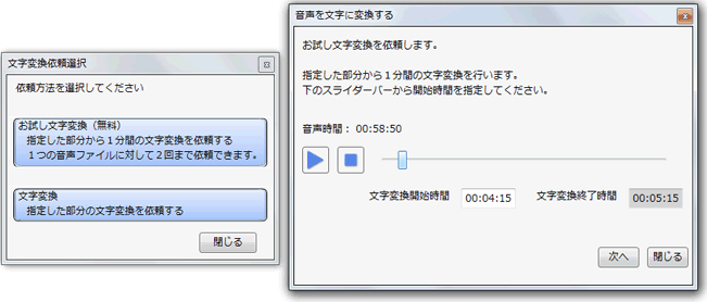 録音音声の文字化をしたい場合、「音声を文字に変換」をクリック。依頼方法としては「お試し文字変換(無料)」と「文字変換」の2種類から選択可能。「お試し文字変換(無料)」は、指定した部分から1分間の文字変換をいつでも無料で行えるというもの。依頼したい音声に対し、まずは無料で文字変換結果を確認できるというのは非常にうれしいサービス。1つの音声ファイルに対して2回まで依頼可能なので、ぜひ有効に活用したい。