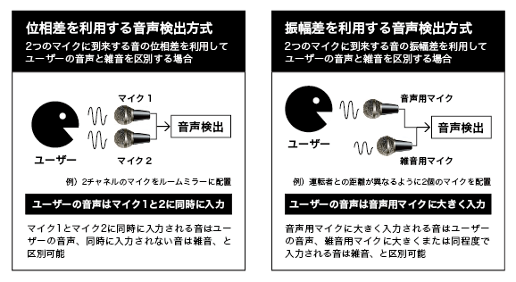 2マイクでの音声検出では、2個のマイクを使ってユーザーの音声と雑音を空間的に区別して、音声を検出する。これはユーザー以外の人の音声(例えば運転者以外の助手席の声)が雑音に含まれる場合に特に有効だ。