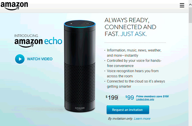 端末は直径3.27インチ(8.3cm)、高さ9.25インチ(23.5cm)の円筒形。本体にはスピーカーを2つ、マイクを7つ内蔵し、ディスプレーはなく、命令に対して音声で答えてくれる。価格は199ドル(Prime会員向けには99ドル)。ただし購入には、今はアマゾンからの招待状が必要とのこと。