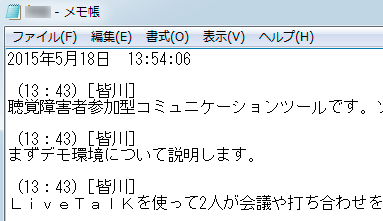 発言はテキスト形式で保存可能。ファイルには発言時間、発言者、発言内容が保存される。なお、発言時間や日時は各パソコンの「日付と時刻」設定が反映されるとのこと。