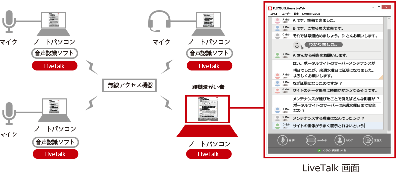 「FUJITSU Software LiveTalk」(以下、LiveTalk)は、富士通と富士通ソーシアルサイエンスラボラトリ(富士通SSL)が共同開発した聴覚障がい者参加型コミュニケーションツール。会議や授業など複数人が情報を共有する場において、発話者の発言を音声認識し、即時テキストに自動変換して複数のパソコン画面に表示することで、聴覚障がい者を含む参加者全員がリアルタイムに情報を共有できるソフトウエアだ。