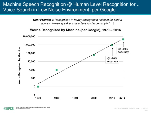Googleの音声認識の認識率を見ても2010年には70%だったのが2016年には90%に。音声認識技術はここ数年で性能が格段に向上している。