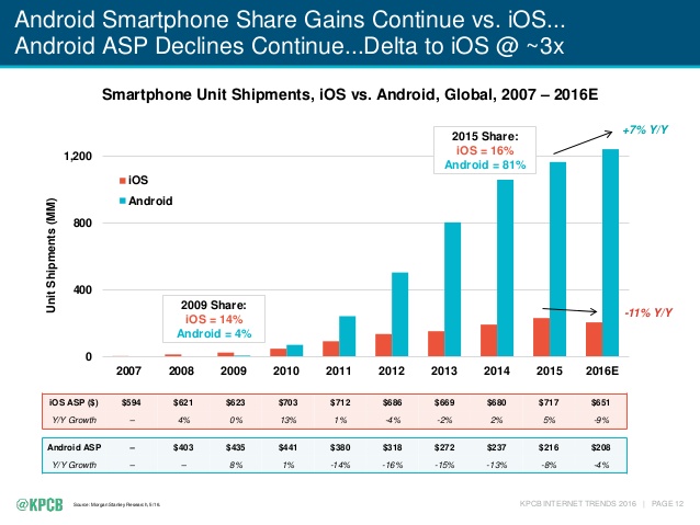 グローバルで見たスマホの出荷台数は、2009年にはiOS:14%、Android:4%だったが、2015年はiOS:16%、Android:81%と差が拡大。2016年は、前年比でAndroid 7%増、iOS11%減で、ますます差がついているという結果に。