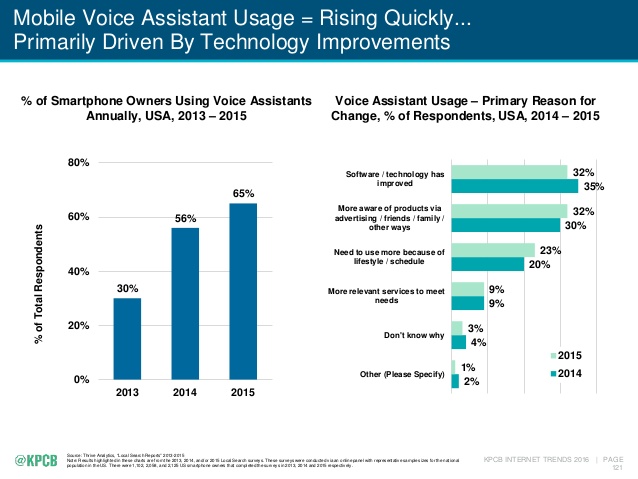 米国で音声アシスタントを利用するユーザーの割合は、2013年には30%だったのが2014年には倍近く増え、2015年には65%に。性能の向上に伴い利用する人も確実に増えている。