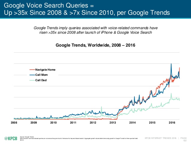 「Navigate Home」、「Call Mom」、「Call Dad」のいずれもが2013年の序盤から急増している。これは2014年に、グーグルでは例えば家族なら名前を言わなくても「Call Mom」で電話をかけられるといったように、より自然に音声コマンドが利用できるようになったという背景があるようだ。シンプルで実用的な音声コマンドによって音声を使う人が増加したといえるだろう。